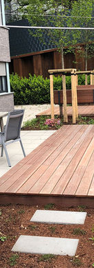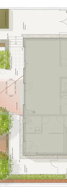 Der Bestand bleibt Großteils in der Neuplanung erhalten. Um zusätzliche Aufenthaltsqualitäten zu schaffen wurde die Rasenfläche im Gartenbereich entfernt. An Stelle des Rasens entstanden entlang der befestigten Flächen zwei erhöhte Holzpodeste. Eine festinstallierte Sitzbank ergänzt das kleinere Holzpodest. Die übrigen Flächen erhielten eine ansprechende Pflanzung aus Solitärbäumen, Stauden und kleineren Gehölzen. Die angrenzende Böschung wurde durch einzelne Blütensträucher ergänzt.Die Installation eines Sonnensegels schützt die exponierten Aufenthaltsflächen vor der Sonne. Der Eingangsbereich wurde ebenfalls durch eine attraktive und vielfältige Bepflanzung aufgewertet.